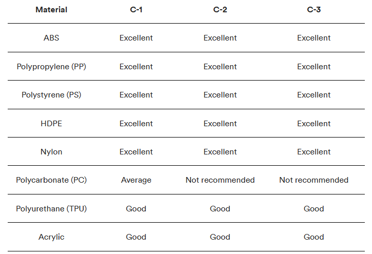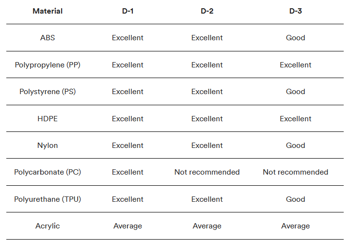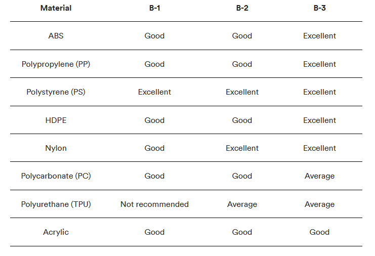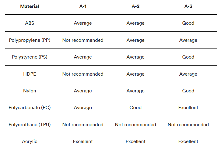 SPI yt-/formfinish ger olika resultat beroende på vilket material du använder för formsprutningskomponenter. Tabellerna nedan beskriver hur du väljer rätt formfinish och material för din specifika applikation.